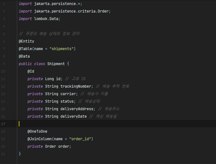 -Shipment : 주문의 배송 상태와 정보